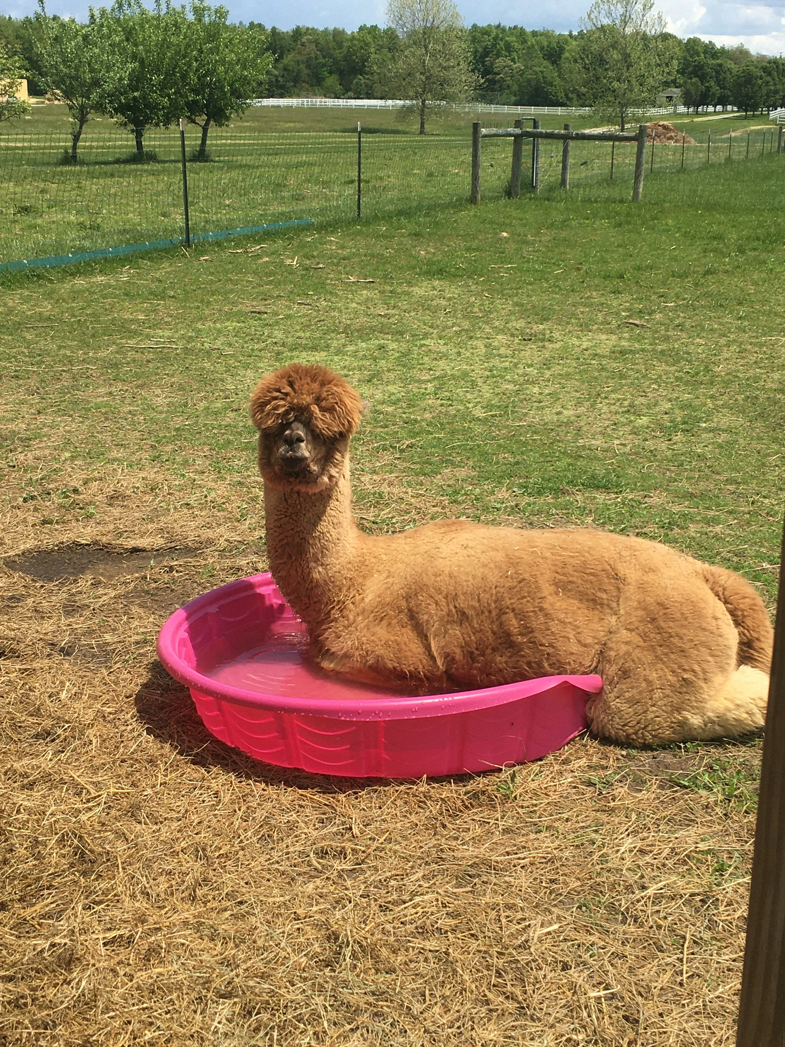 Our alpacas have their own distinct personalities. Bernie, the oldest, is by far the grumpiest and least social of the three. His fleece is a gorgeous brown, and it is thick with a very nice crimp. He will voice his displeasure with a low moan, which we hear often! All alpacas have a “zone of intolerance,” one in which they do not like other alpacas (or humans) to cross. Bernie’s zone is rather large and Oliver, who is the herd brat, will cross it on a regular basis just to annoy him. It is literally the alpaca version of a little brother playing the “I’m not touching you” game!